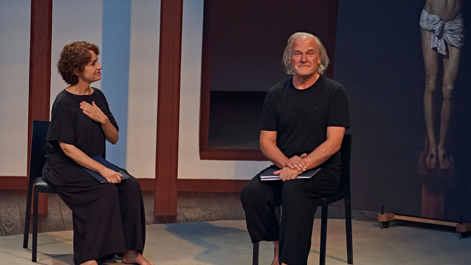 La puesta en escena aúna tres disciplinas artísticas: la poesía mística de San Juan de la Cruz, la música con piezas de la Música callada de Mompou o la pintura con el cuadro Cristo crucificado de Velázquez