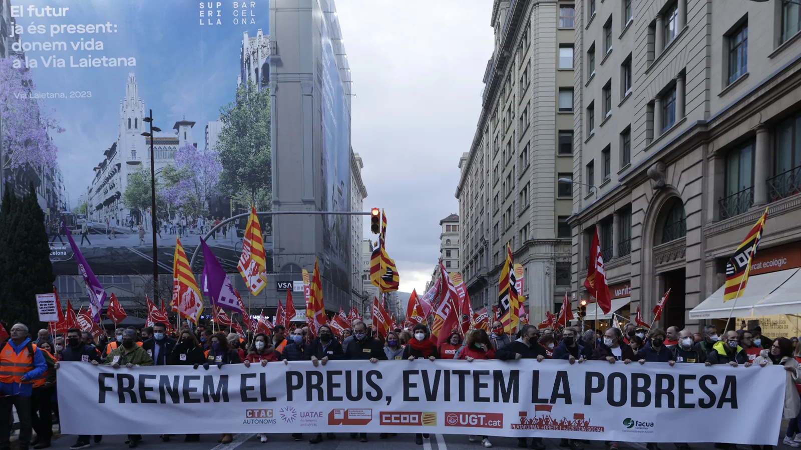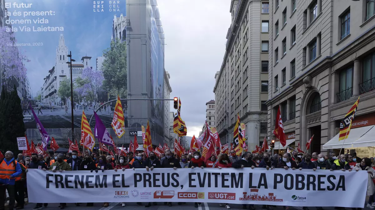 Bajo el lema "Frenemos los precios, evitemos la pobreza", los manifestantes convocados por CC.OO., UGT, CTAC Autónomos, UATAE, Facua y la CONFAC, que han cifrado en 3.000 personas la afluencia a la protesta, han recorrido el centro de Barcelona desde la plaza Urquinaona hasta la plaza Sant Jaume.