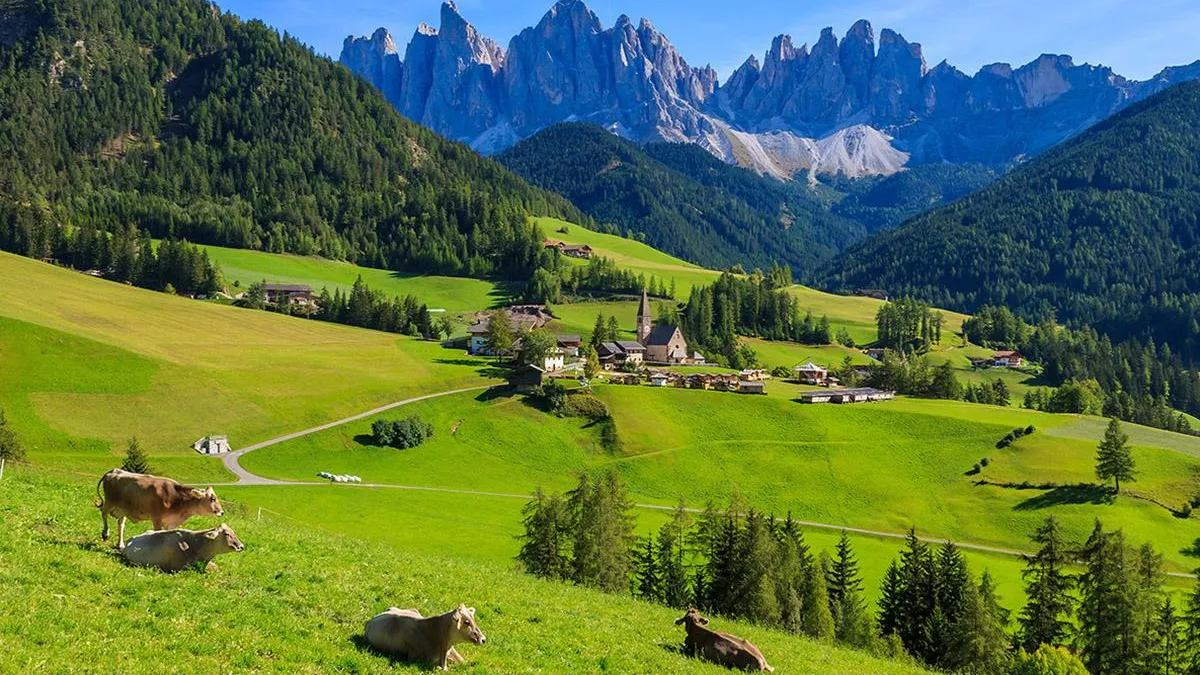 La primera parada es para visitar la pequeña iglesia de San Giovanni in Ranui, ubicada en el corazón del hermoso paisaje montañoso de la cordillera de Odle.
