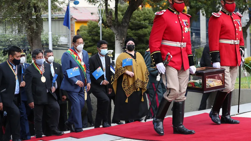 Delante del coche militar, una banda del Regimiento Colorados de Bolivia, una división de las Fuerzas Armadas que es simbólica por su presencia en la Guerra del Pacífico de finales del siglo XIX, abrió paso a la caravana mientras entonaba himnos que reivindican el centenario reclamo por el retorno al mar.